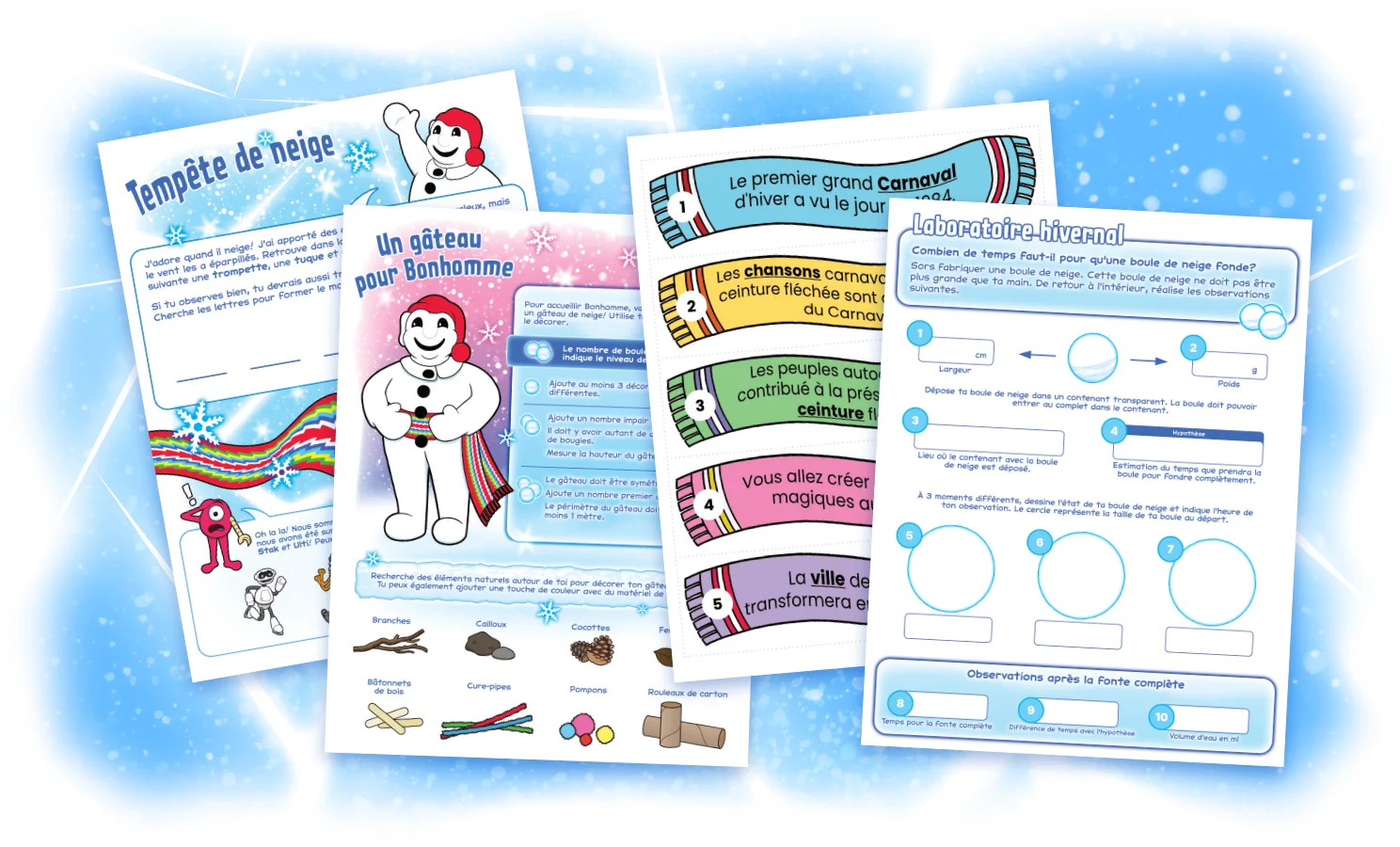 En collaboration avec le Carnaval de Québec, Hourra! a conçu pour les enseignants et les familles un guide d'activités hivernales. Accompagné des Statix, Bonhomme vous propose des jeux actifs et éducatifs pour apprendre à l'extérieur.